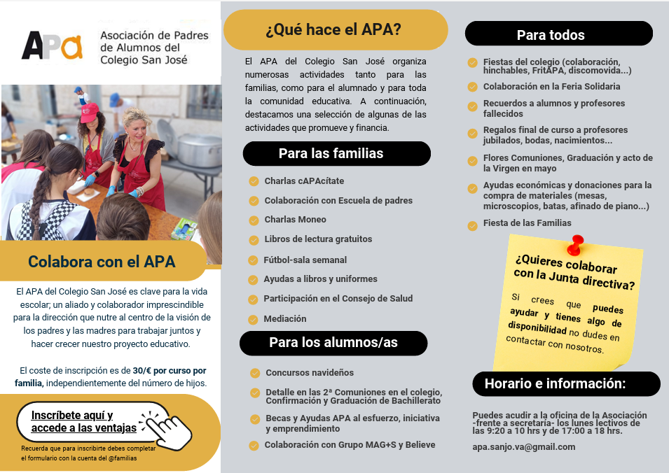 El APA del Colegio San José es clave para la vida escolar; un aliado y colaborador imprescindible para la dirección que nutre al centro de la visión de los padres y las madres para trabajar juntos y hacer crecer nuestro proyecto educativo, por eso es importante colaborar y hacerse socio.